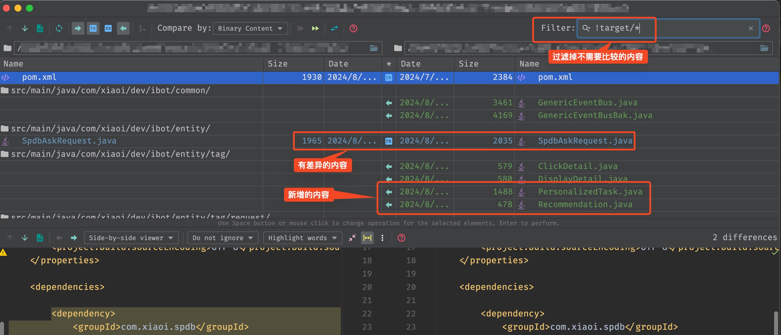 在用了上述的命令后,我想验证一下新建目录和原有目录的文件差异。本来想使用一些命令行工具或者 app 的,但是用了一下 IDEA 后,发现它自带的 diff 工具已经很好用了,截图展示一下
